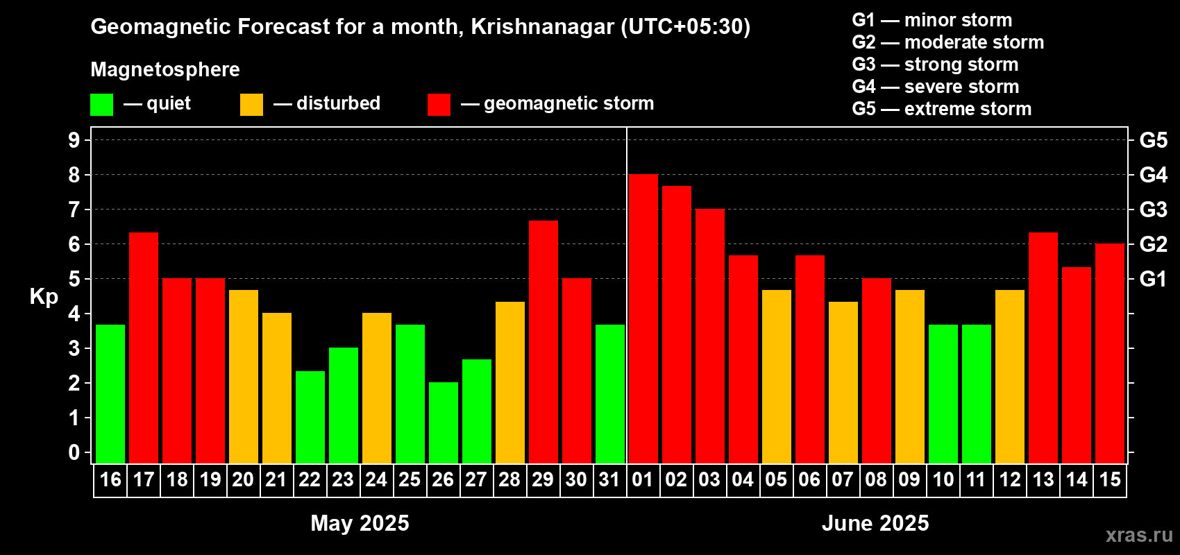 Geomagnetic storm forecast in Krishnanagar for May 16, 2025