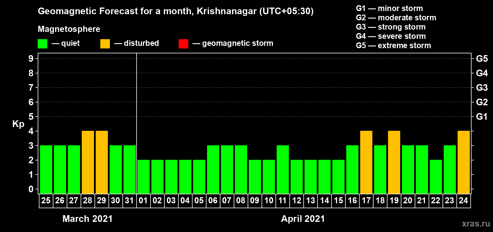 Geomagnetic activity forecast in Krishnanagar — Mar 25, 2021