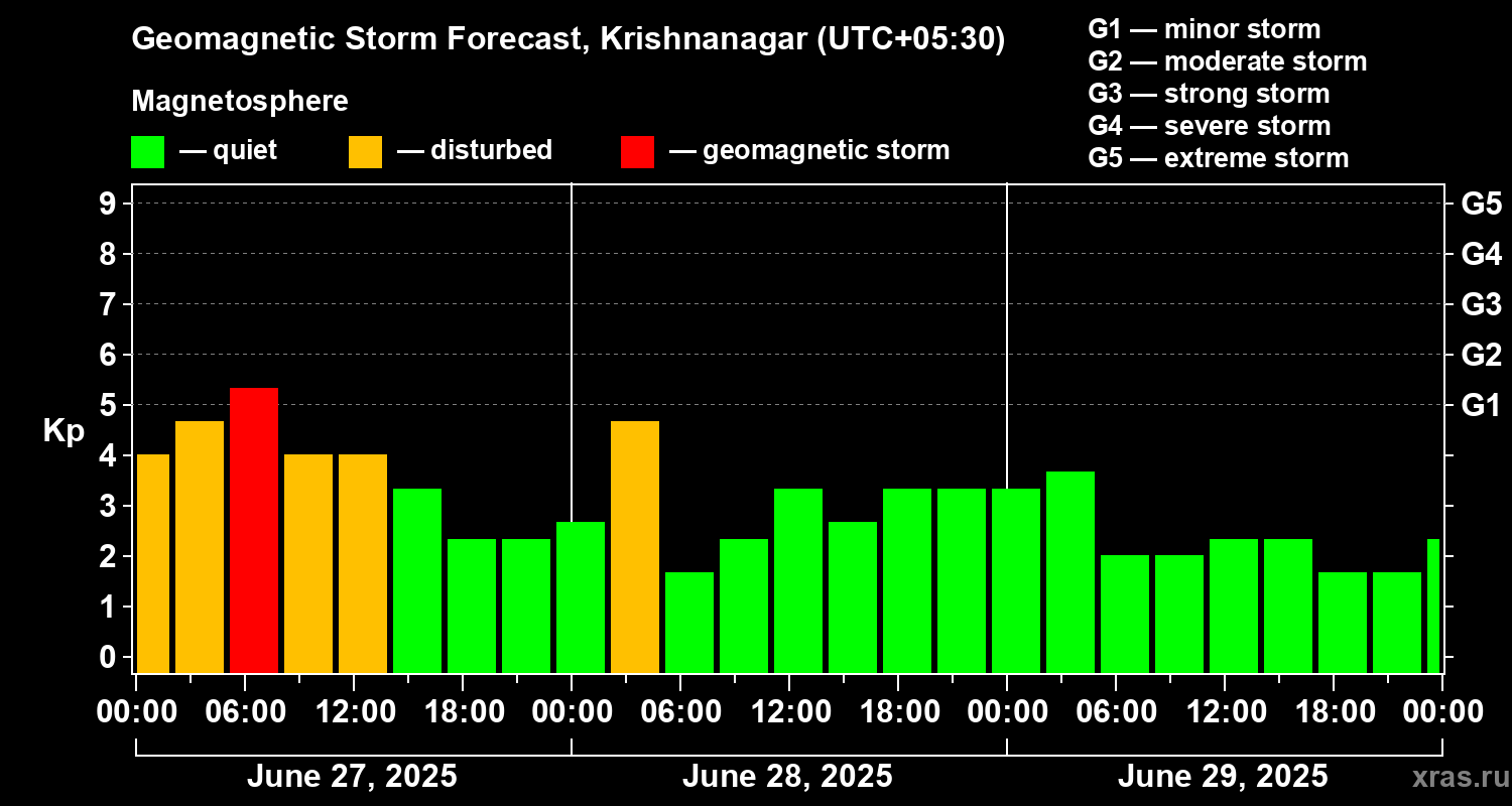 Geomagnetic storm forecast in Krishnanagar for Jun 27, 2025