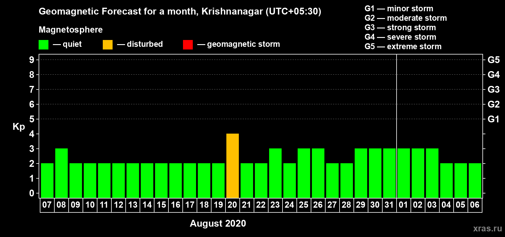 Geomagnetic storm forecast in Krishnanagar for Aug 07, 2020