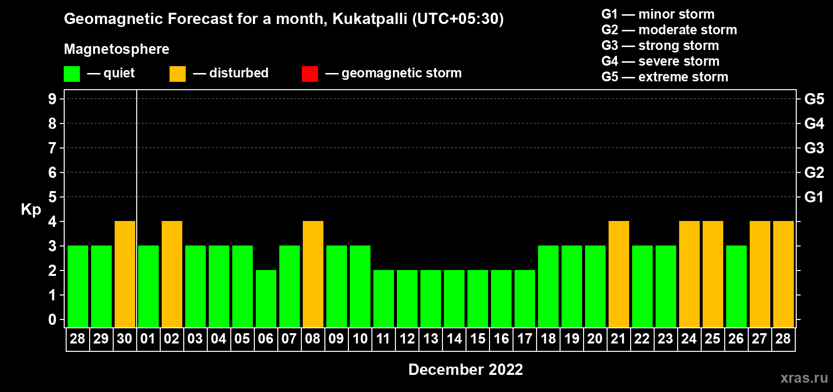 Geomagnetic storm forecast in Kukatpalli for Nov 28, 2022