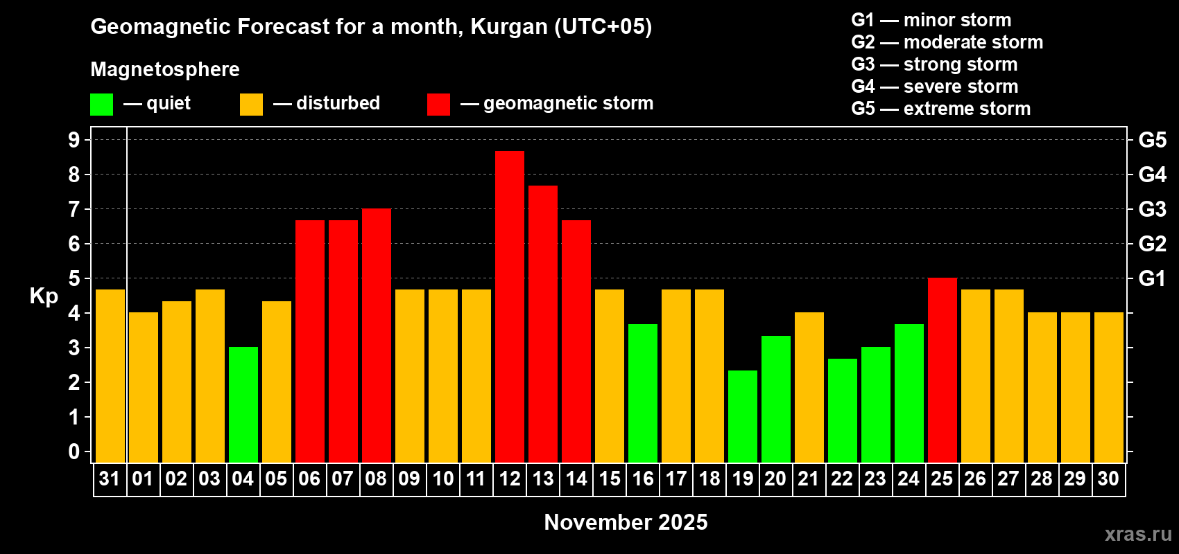 Geomagnetic storm forecast in Kurgan for Oct 31, 2025