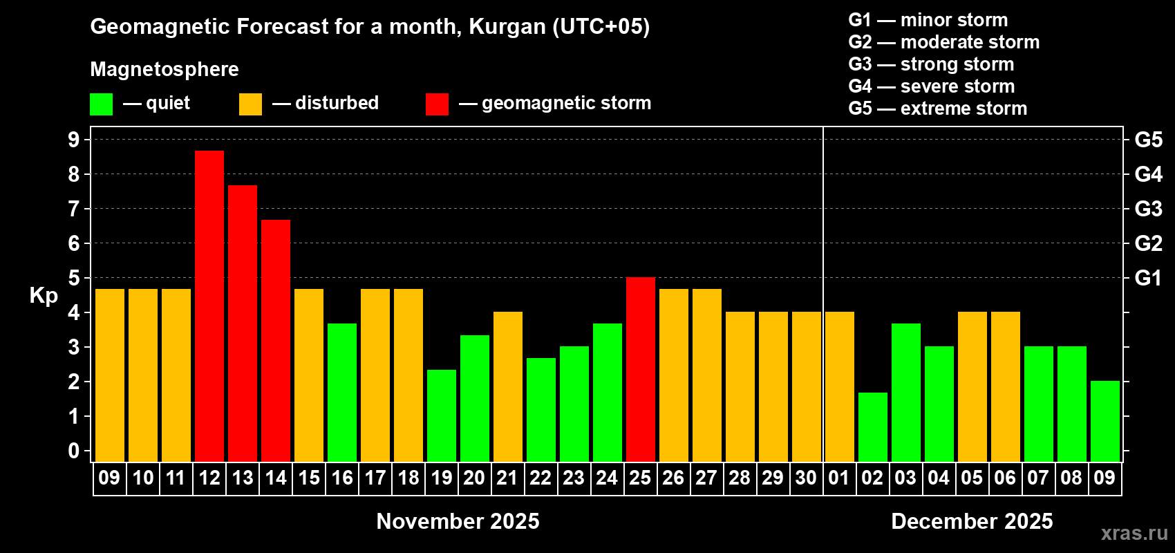 Geomagnetic storm forecast in Kurgan for Nov 09, 2025