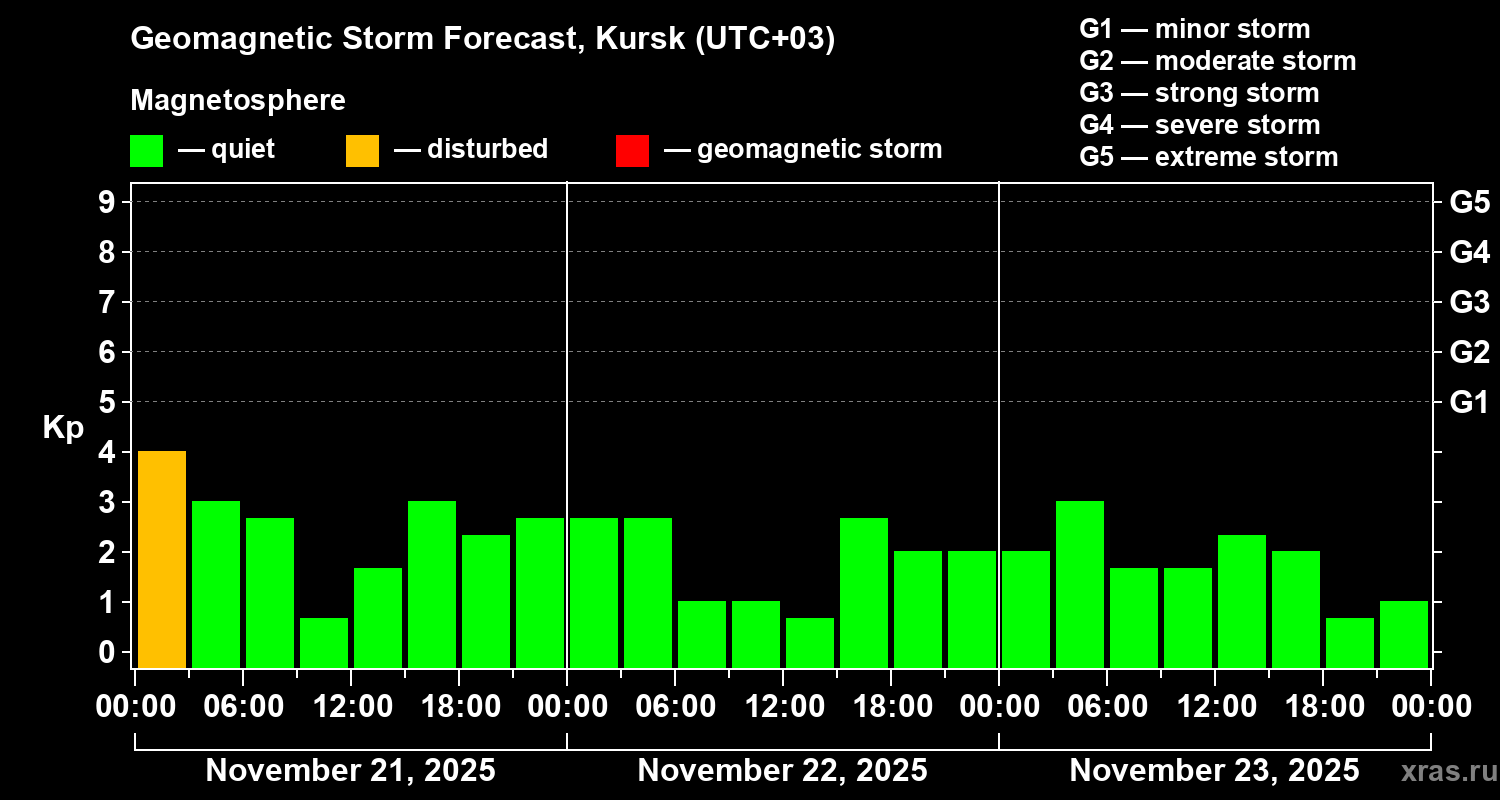 Geomagnetic storm forecast in Kursk for Nov 21, 2025