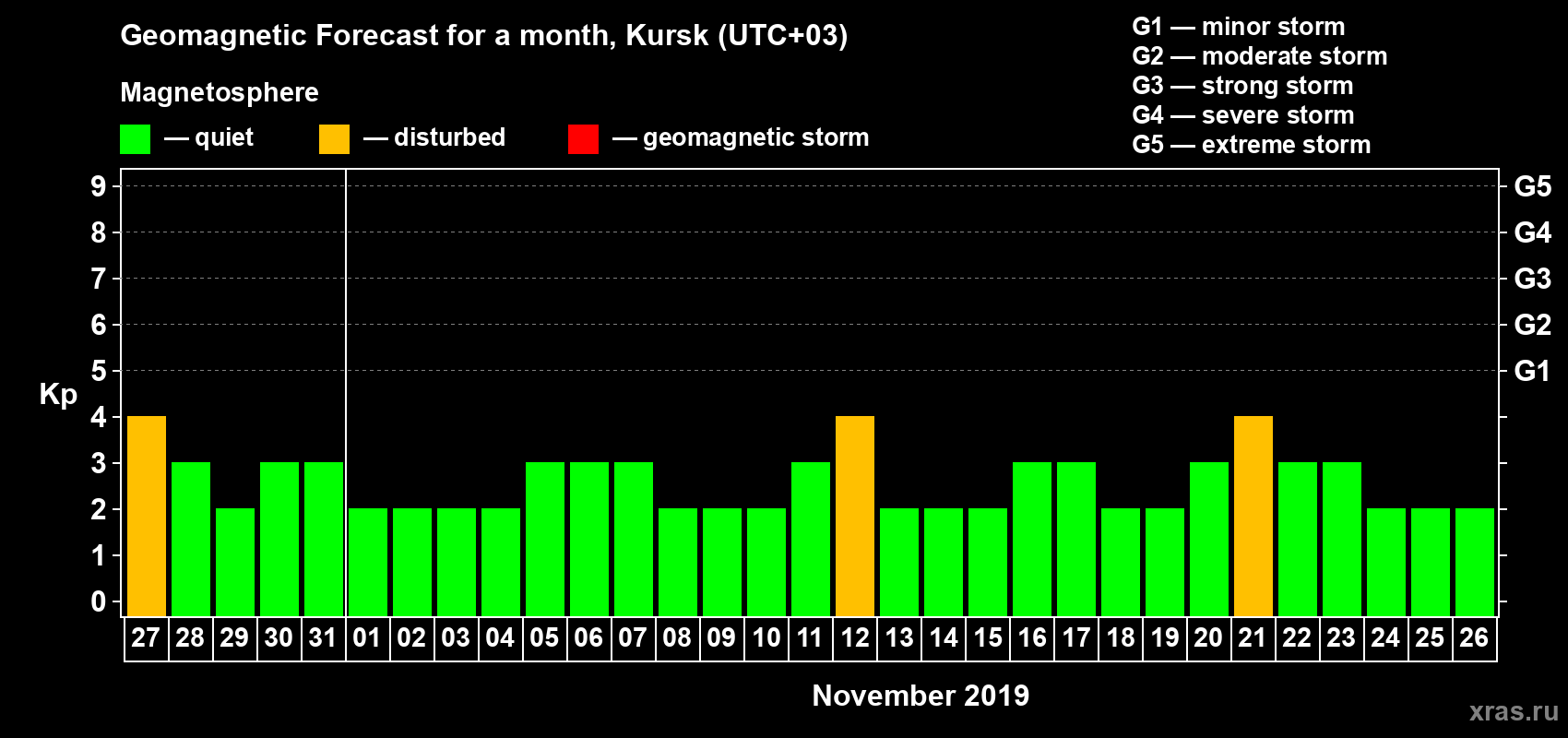 Geomagnetic activity forecast in Kursk — Oct 27, 2019