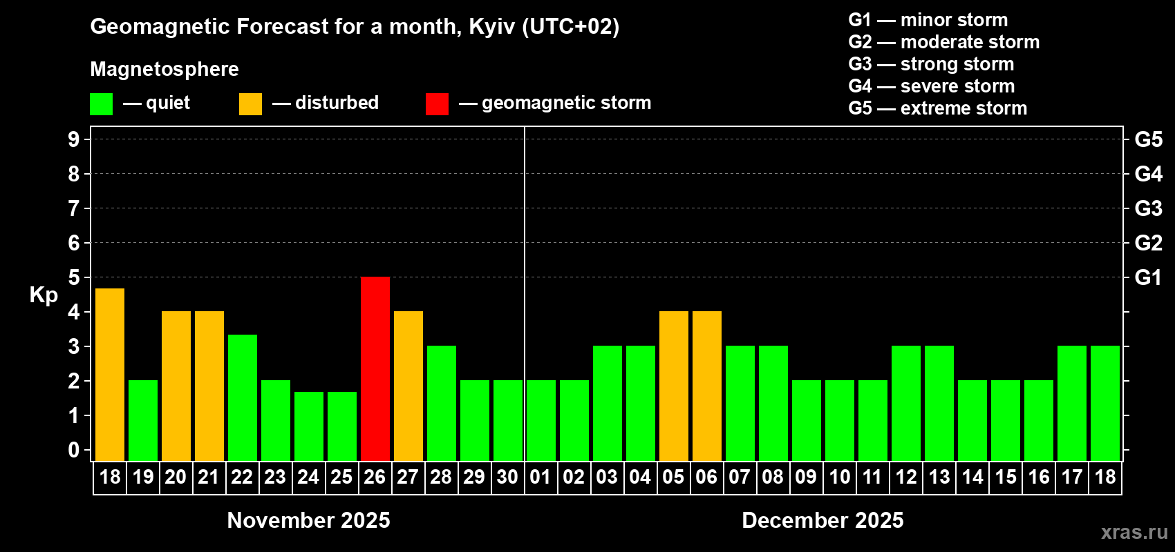 Geomagnetic storm forecast in Kyiv for Nov 18, 2025