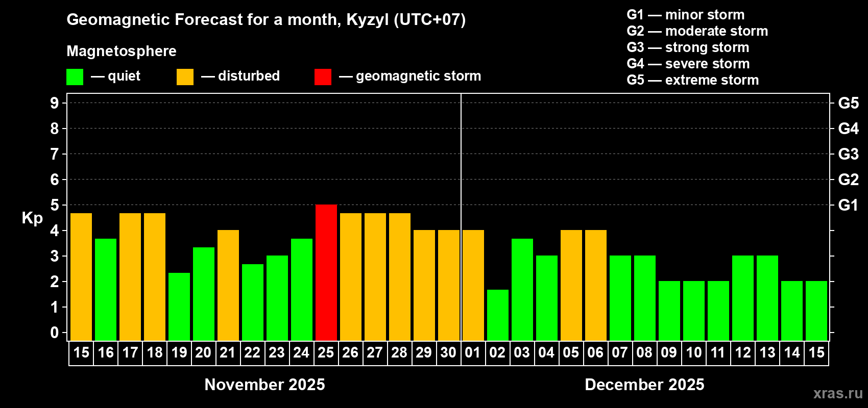 Geomagnetic storm forecast in Kyzyl for Nov 15, 2025