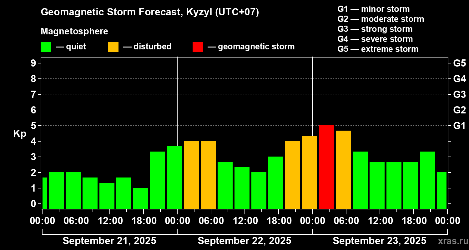 Geomagnetic storm forecast in Kyzyl for Sep 21, 2025