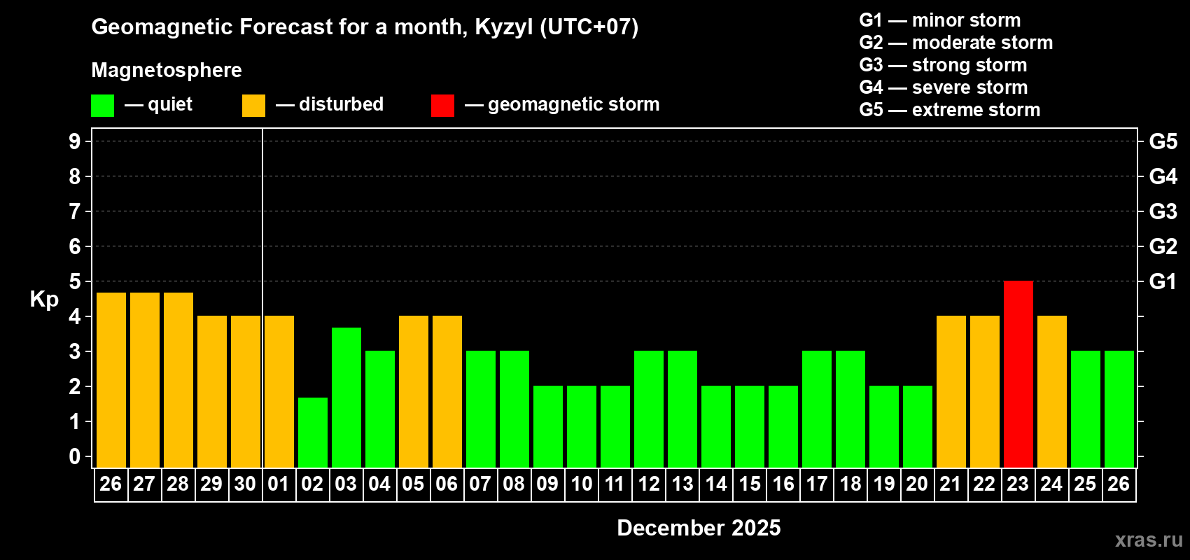 Geomagnetic storm forecast in Kyzyl for Nov 26, 2025