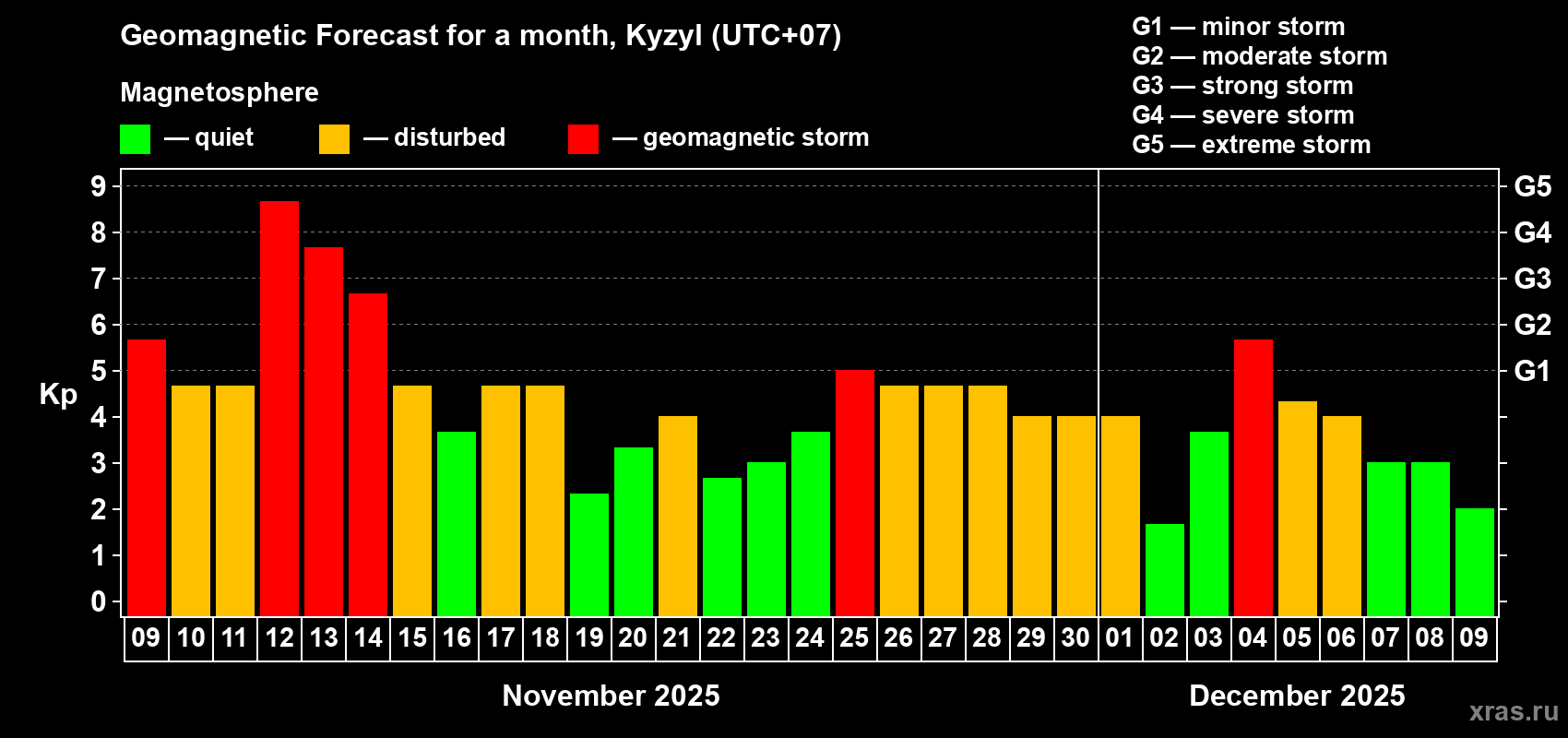 Geomagnetic storm forecast in Kyzyl for Nov 09, 2025