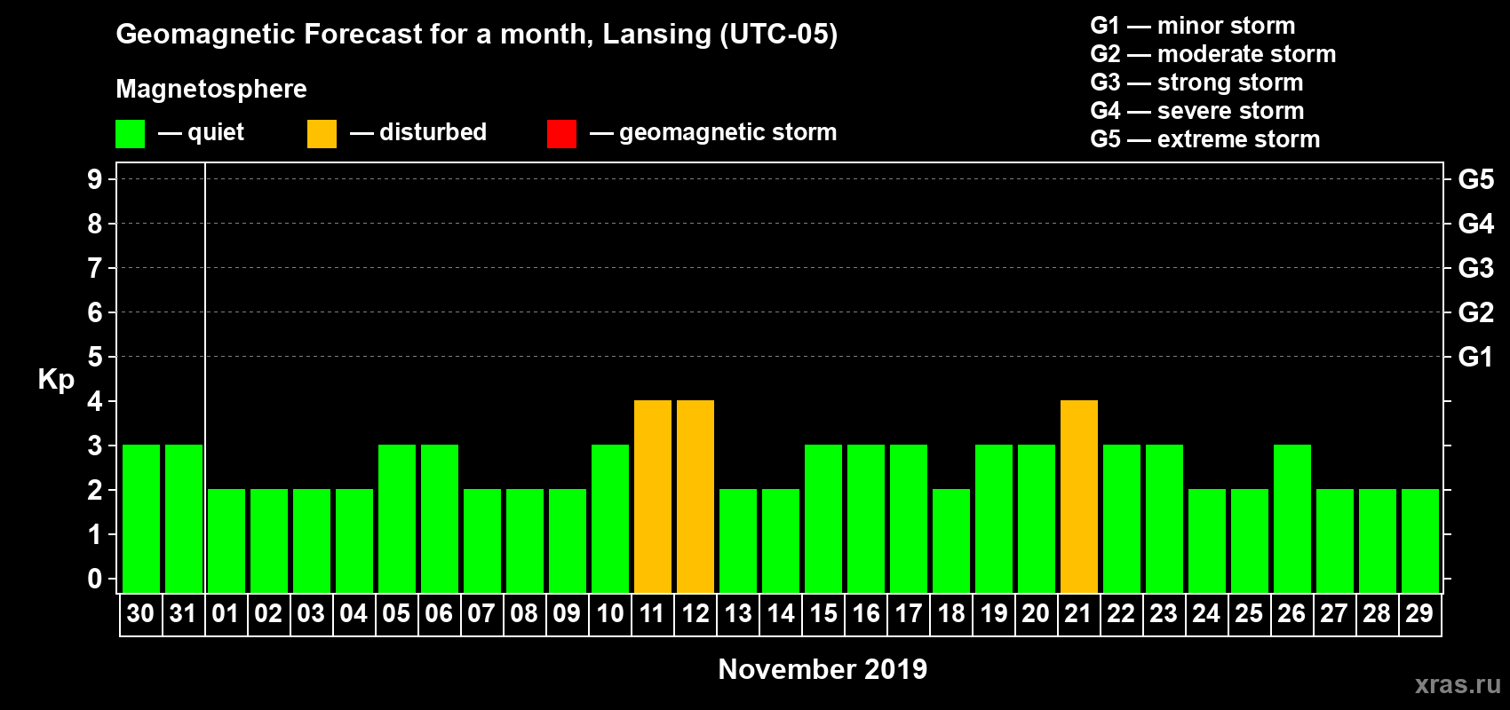 Geomagnetic storm forecast in Lansing for Oct 30, 2019