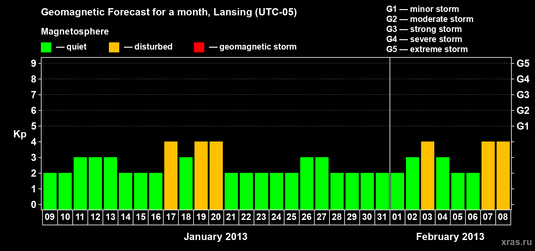 Geomagnetic storm forecast in Lansing for Jan 09, 2013
