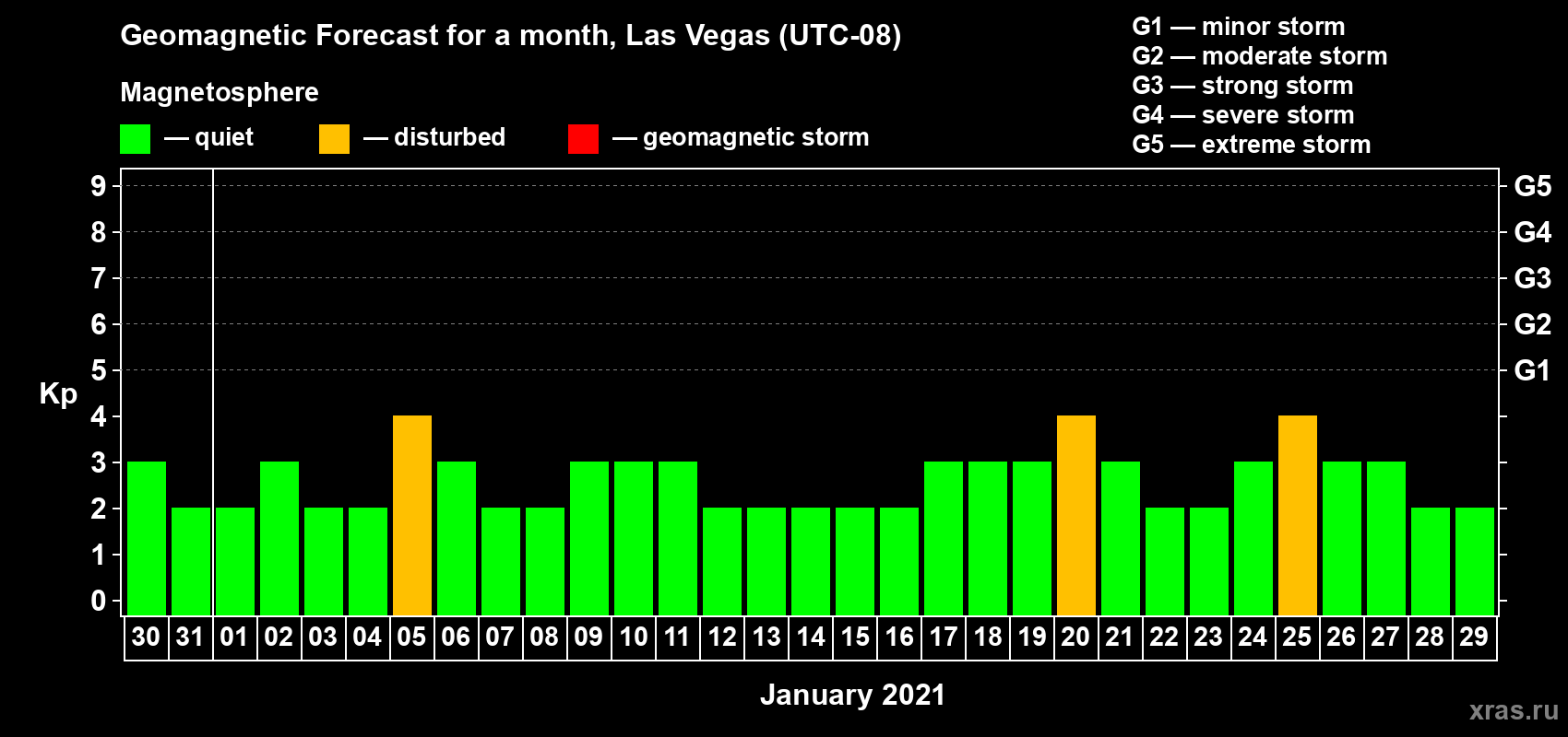 Geomagnetic storm forecast in Las Vegas for Dec 30, 2020