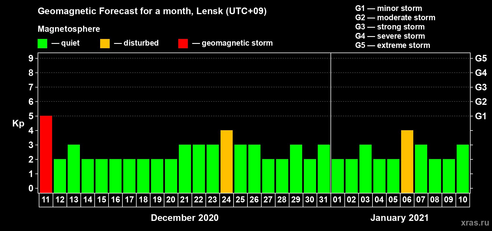 Geomagnetic storm forecast in Lensk for Dec 11, 2020