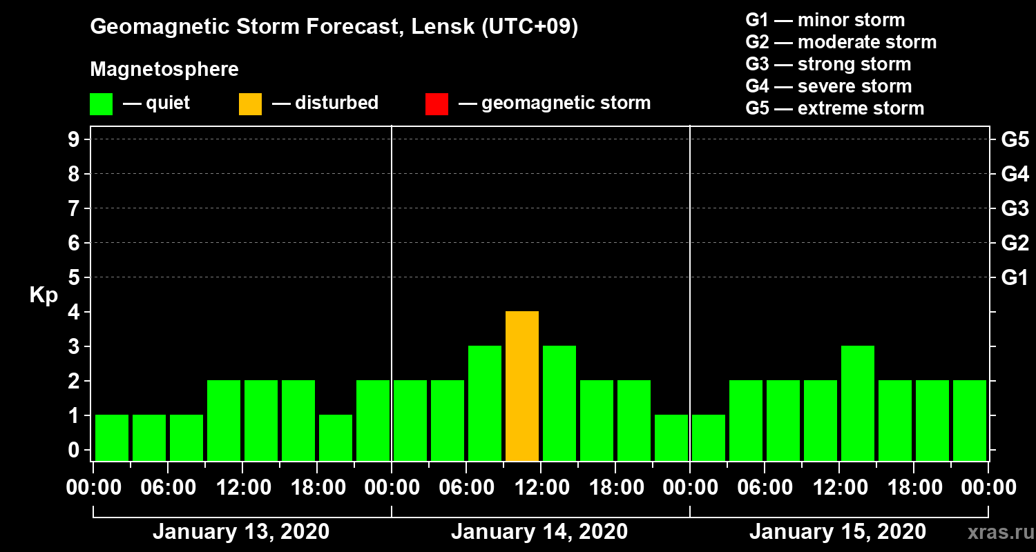 Geomagnetic storm forecast in Lensk for Jan 13, 2020