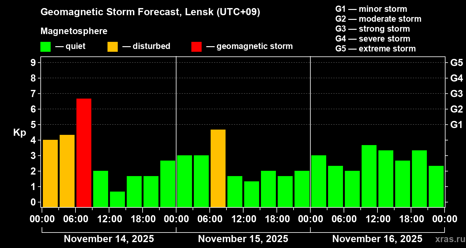 Geomagnetic storm forecast in Lensk for Nov 14, 2025