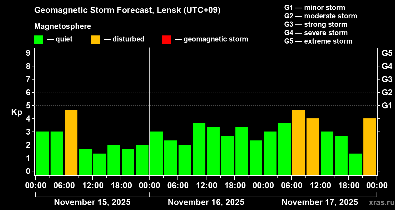 Geomagnetic storm forecast in Lensk for Nov 15, 2025