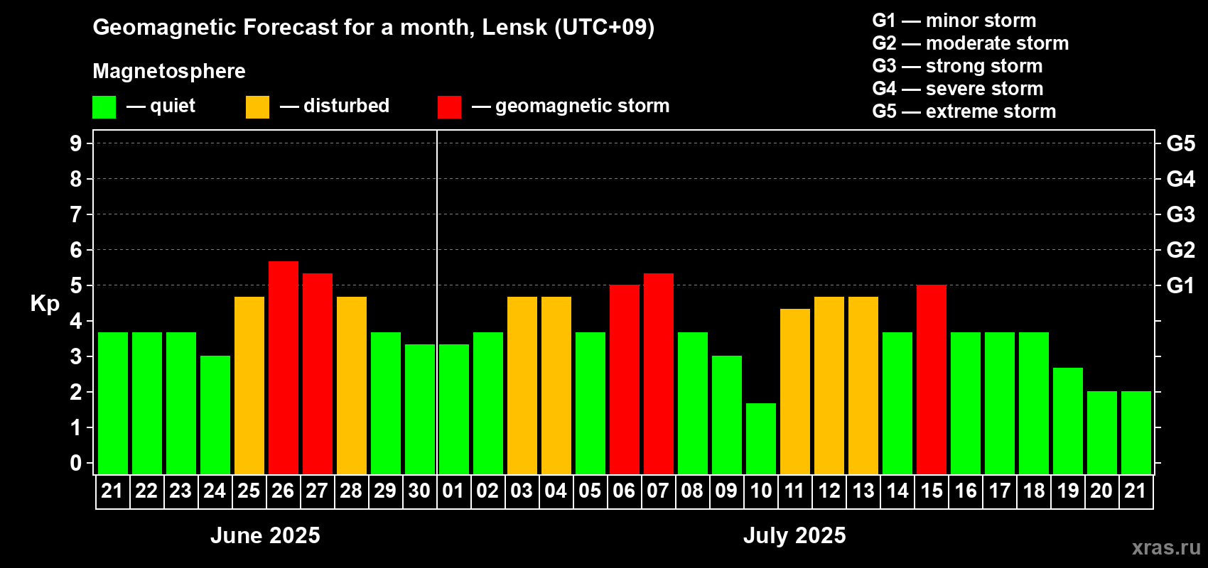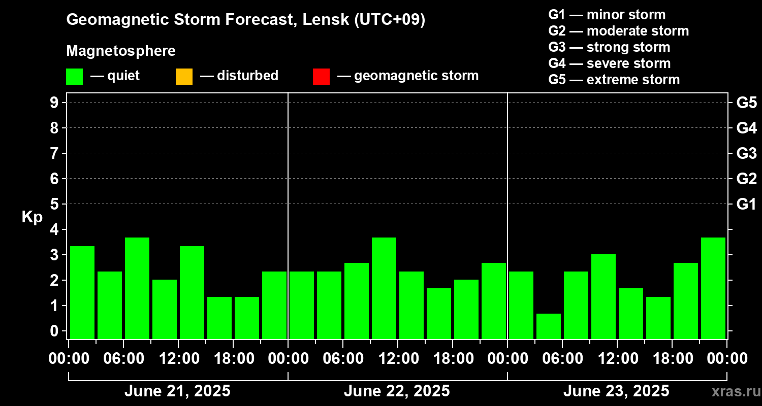 Geomagnetic storm forecast in Lensk for Jun 21, 2025