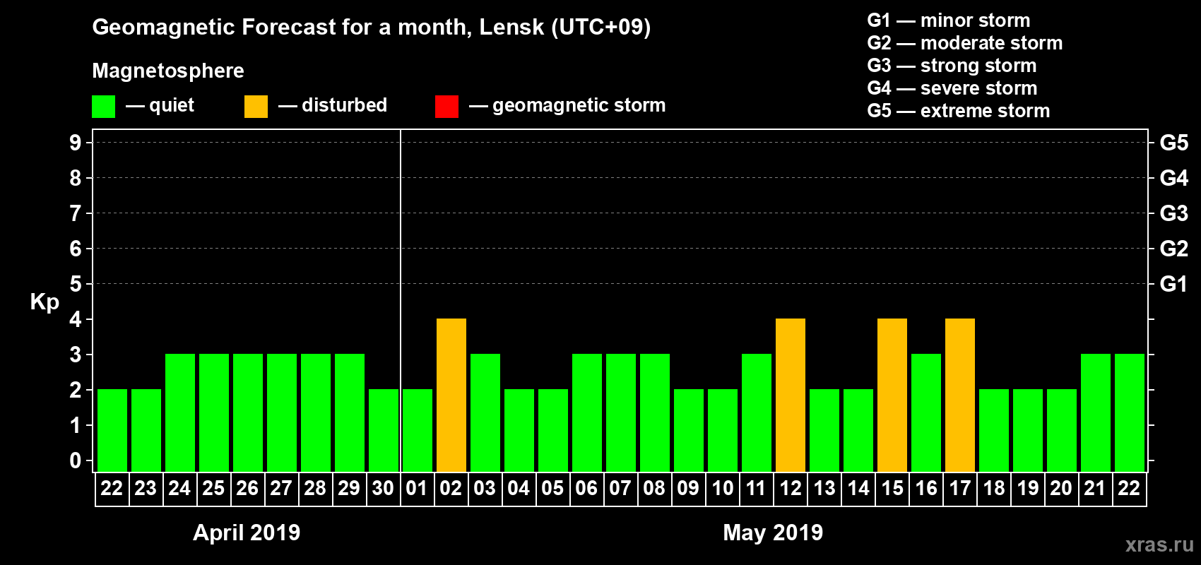 Geomagnetic storm forecast in Lensk for Apr 22, 2019