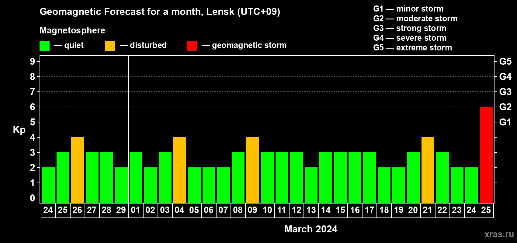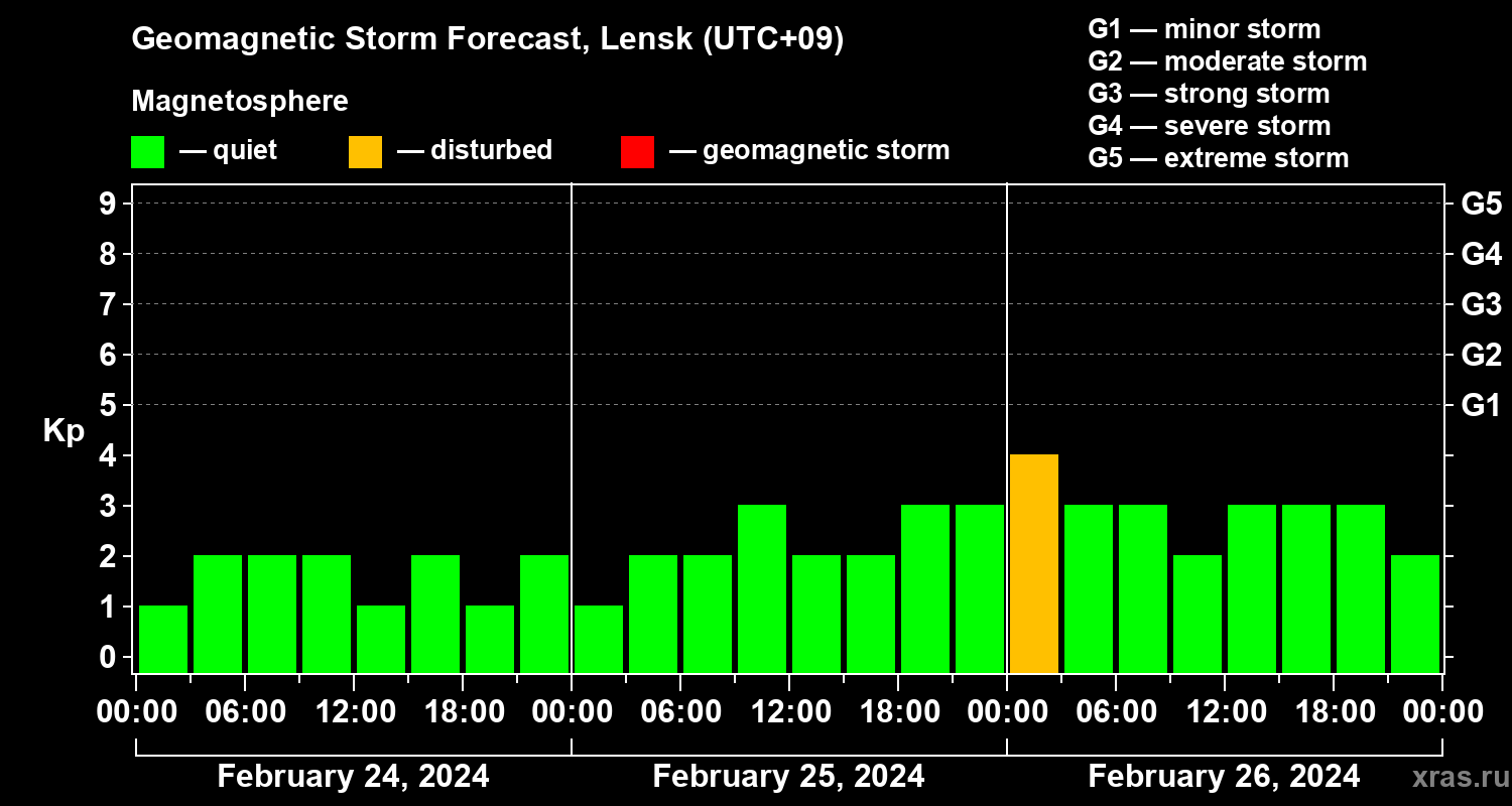 Geomagnetic storm forecast in Lensk for Feb 24, 2024