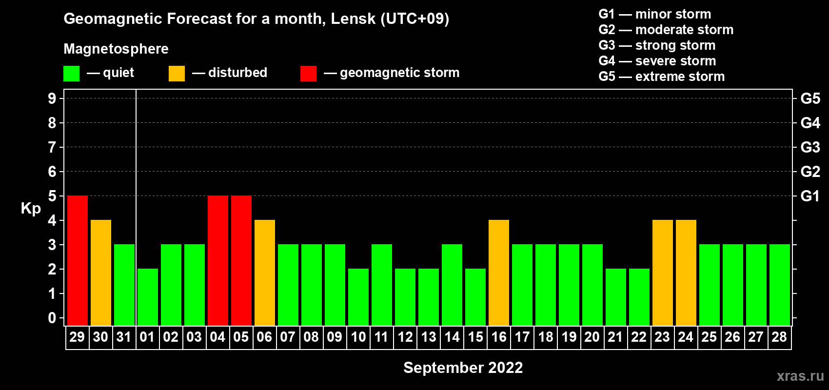 Geomagnetic storm forecast in Lensk for Aug 29, 2022