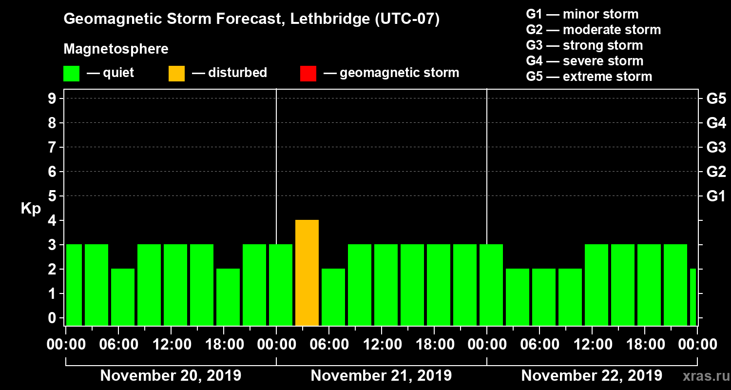 Geomagnetic storm forecast in Lethbridge for Nov 20, 2019