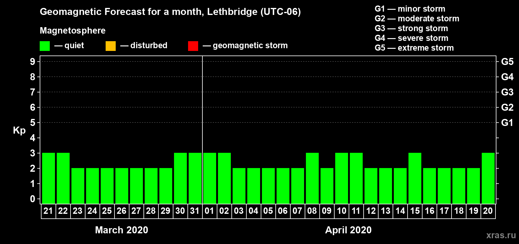 Geomagnetic storm forecast in Lethbridge for Mar 21, 2020