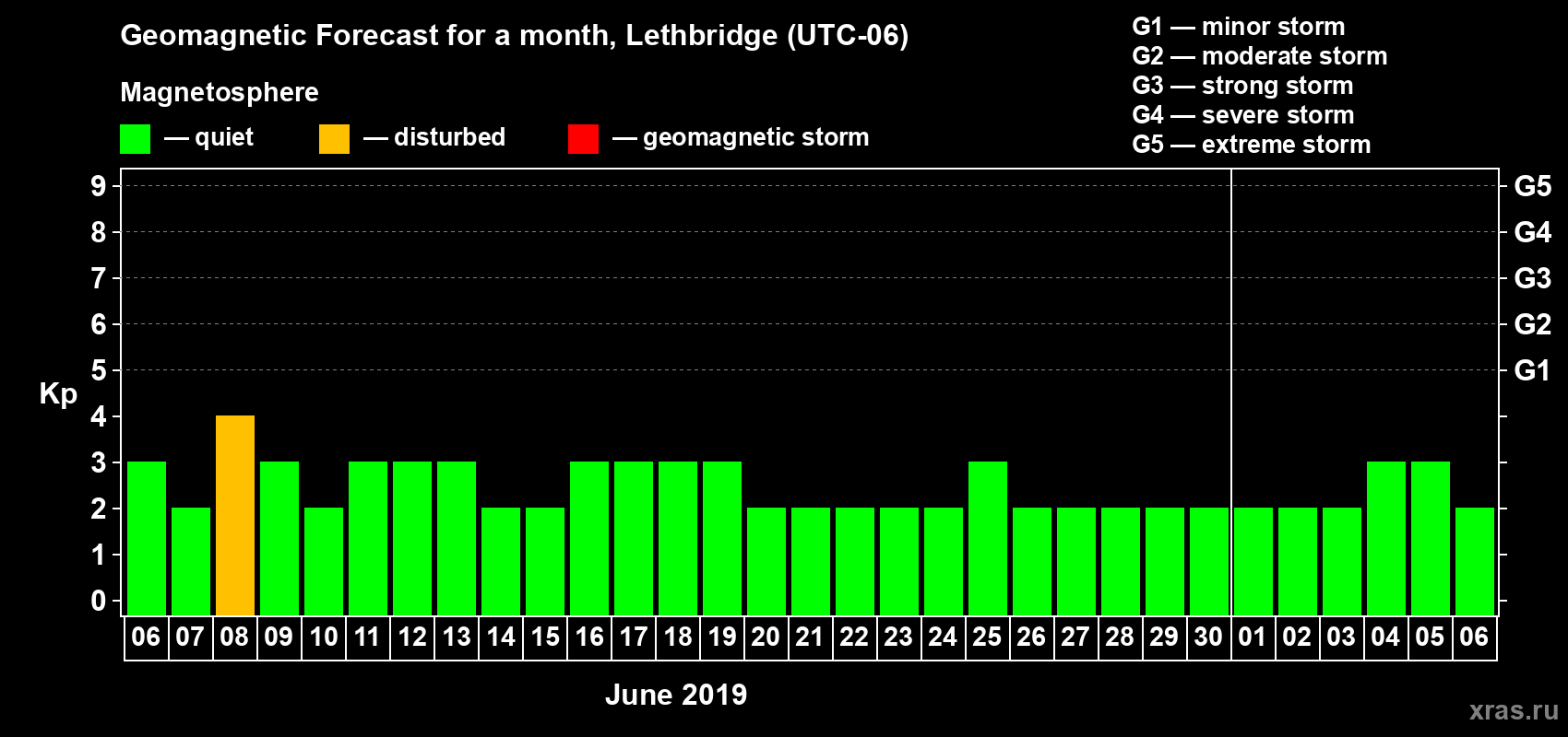Geomagnetic storm forecast in Lethbridge for Jun 06, 2019