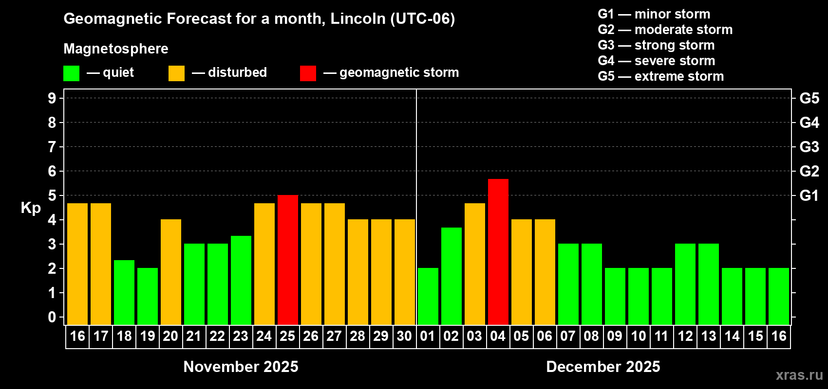 Geomagnetic storm forecast in Lincoln for Nov 16, 2025