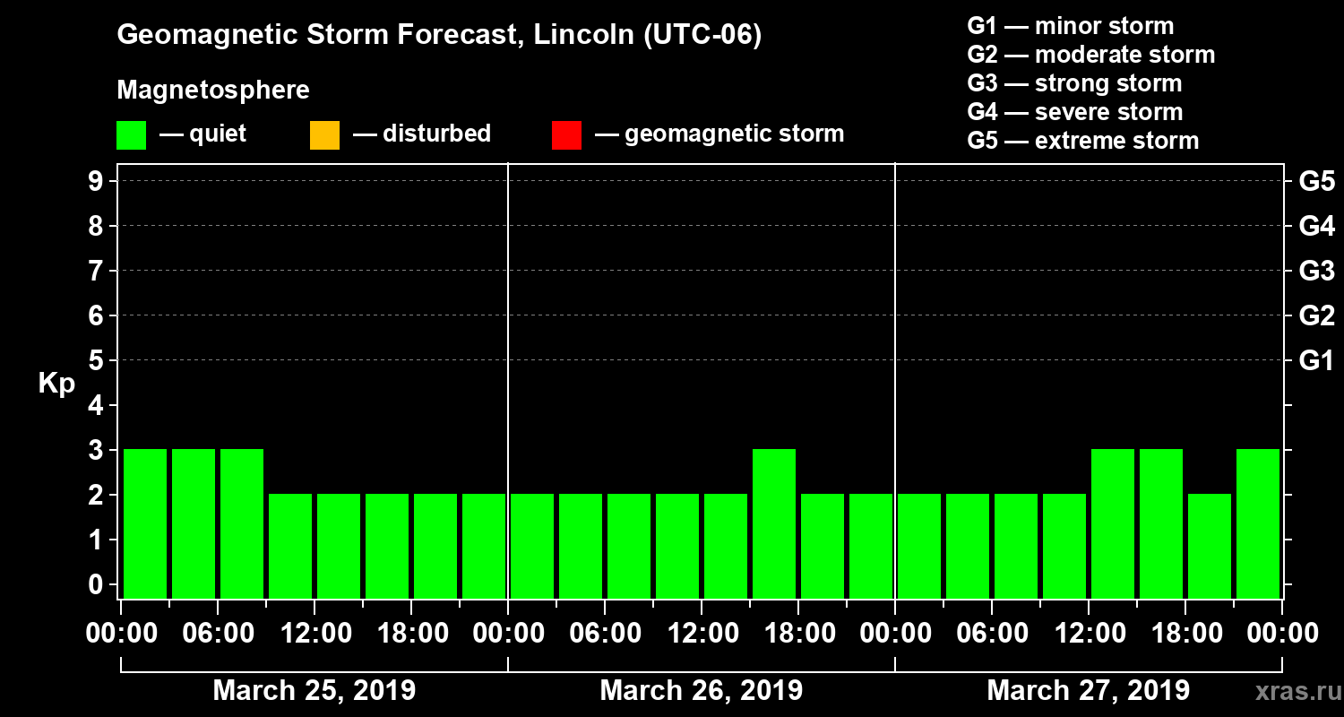 Geomagnetic storm forecast in Lincoln for Mar 25, 2019
