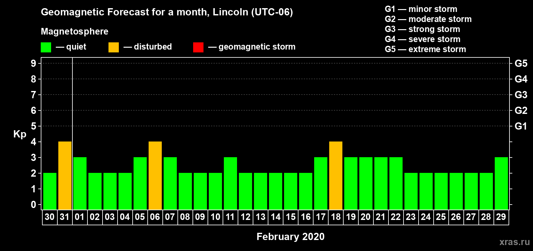 Geomagnetic storm forecast in Lincoln for Jan 30, 2020