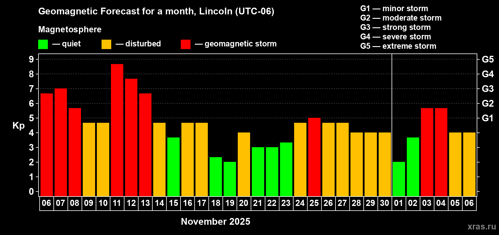 Geomagnetic storm forecast in Lincoln for Nov 06, 2025