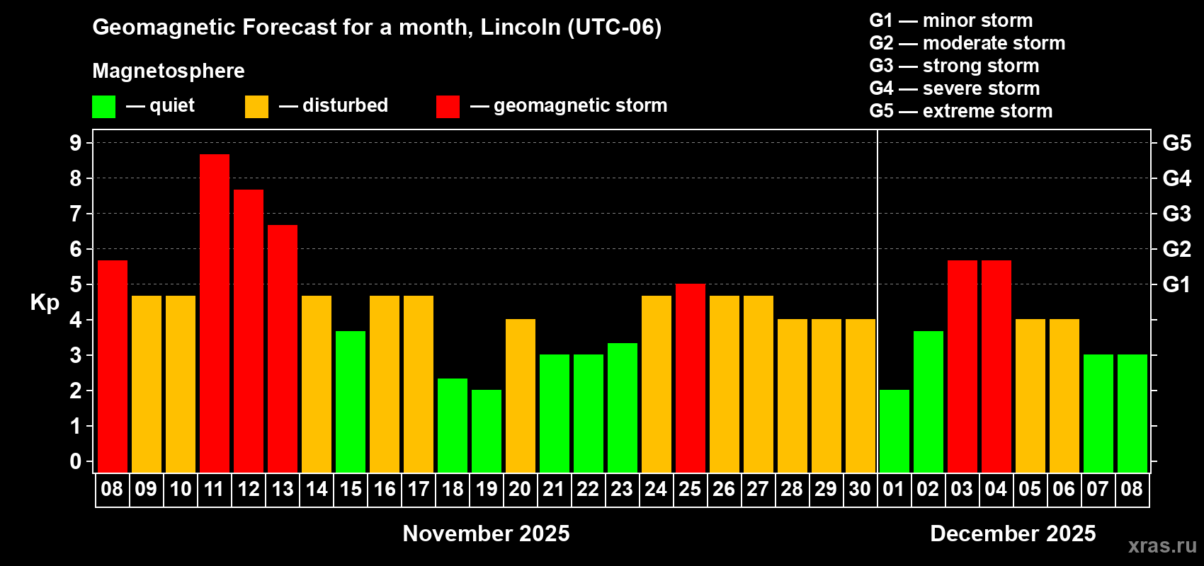 Geomagnetic storm forecast in Lincoln for Nov 08, 2025