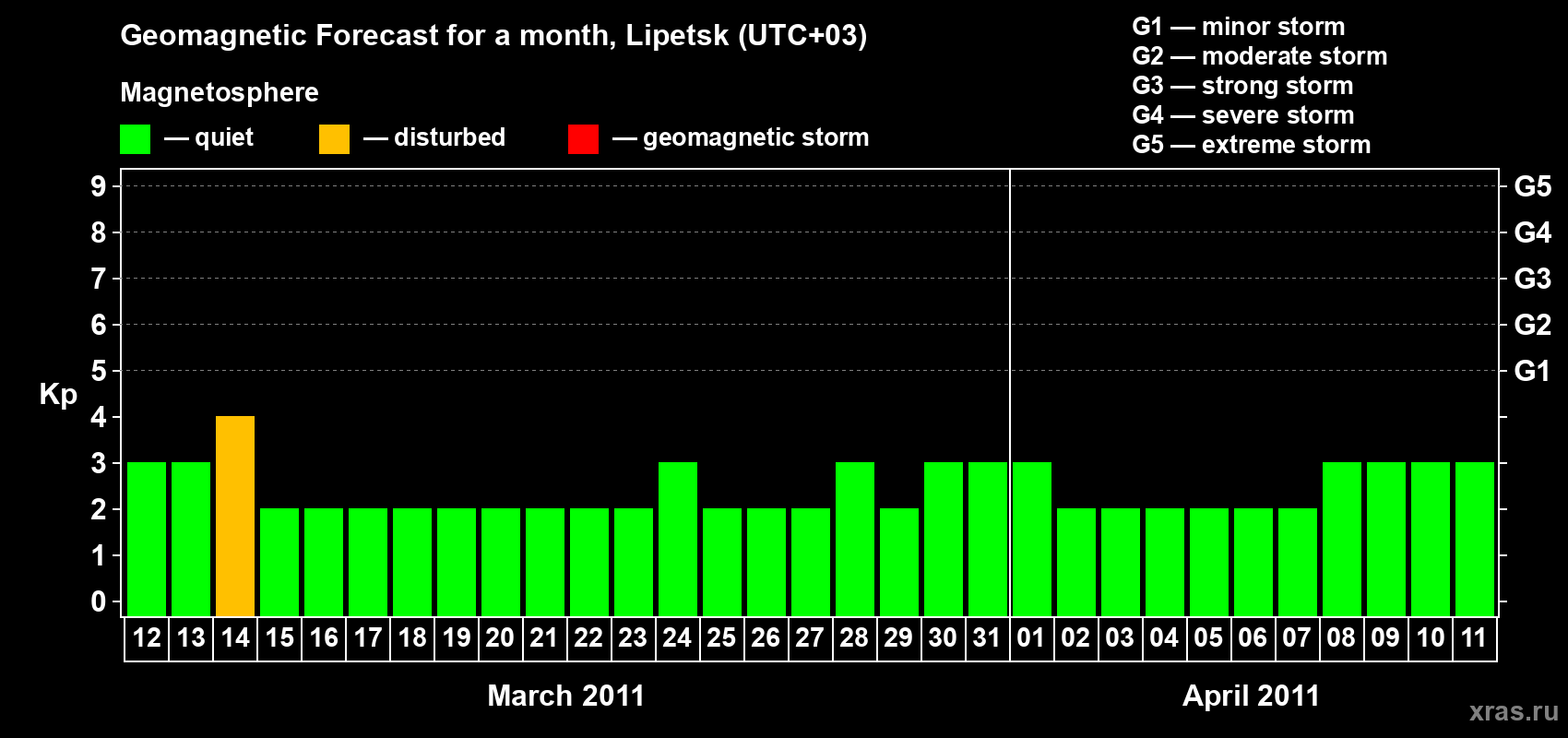 Geomagnetic storm forecast in Lipetsk for Mar 12, 2011