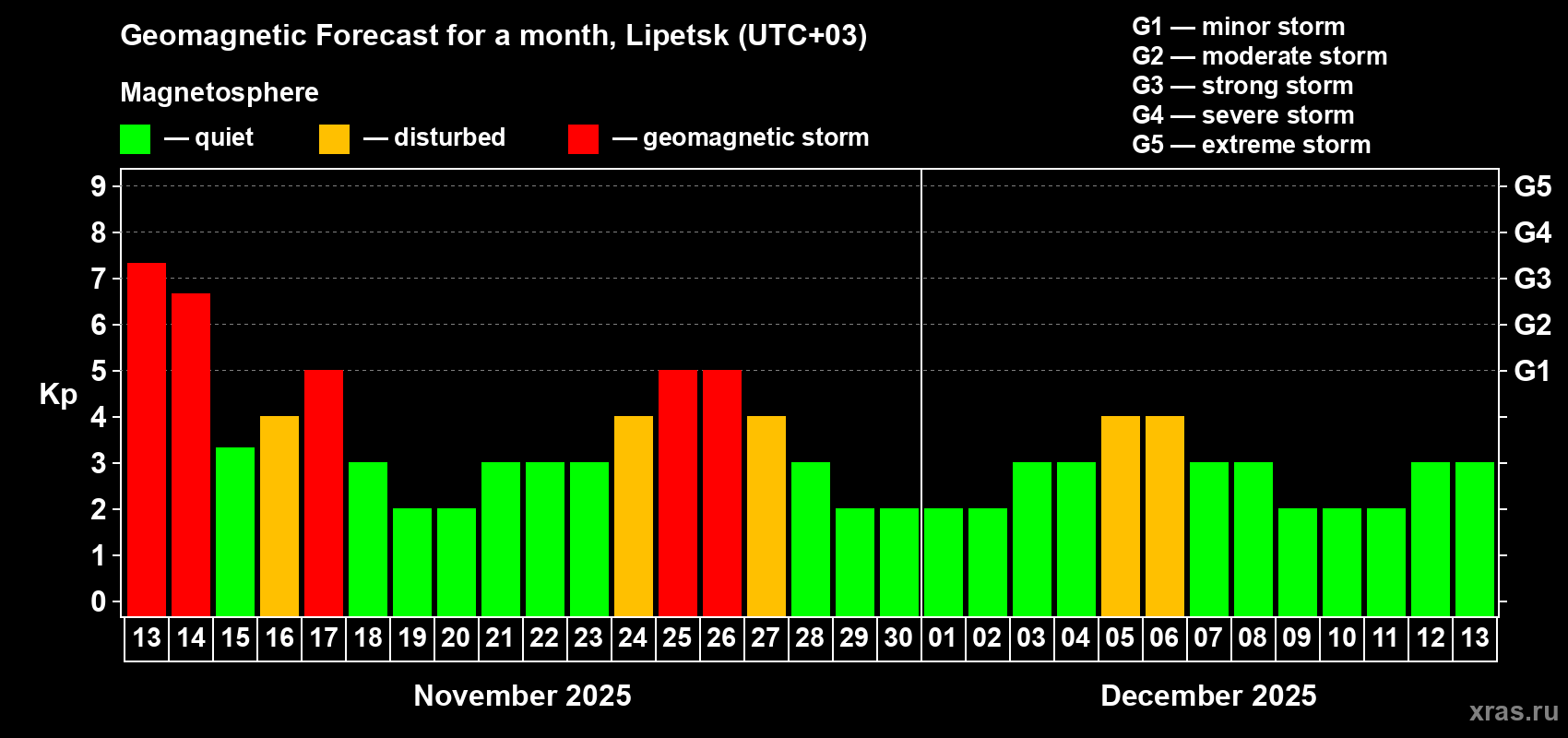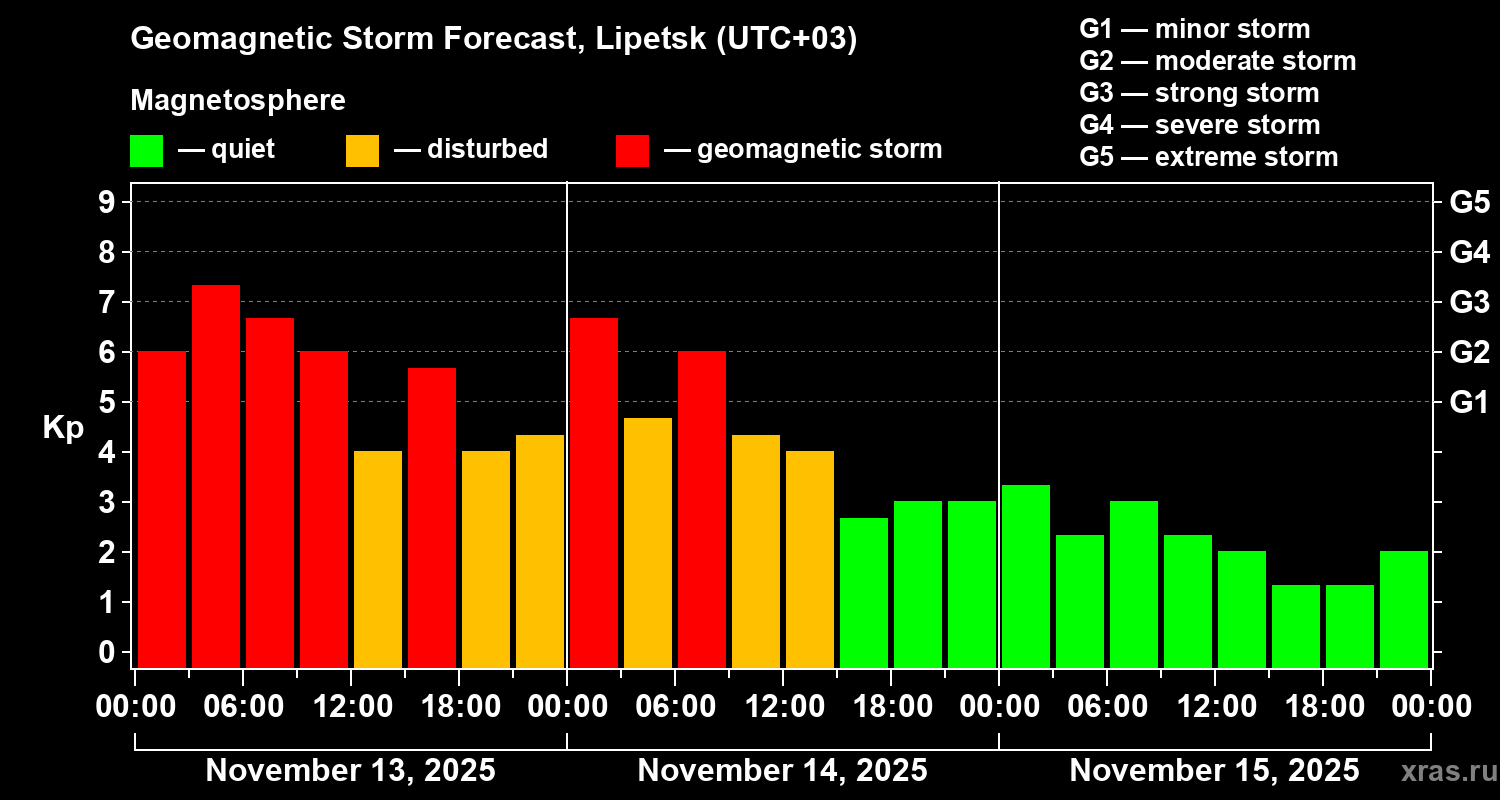 Geomagnetic storm forecast in Lipetsk for Nov 13, 2025