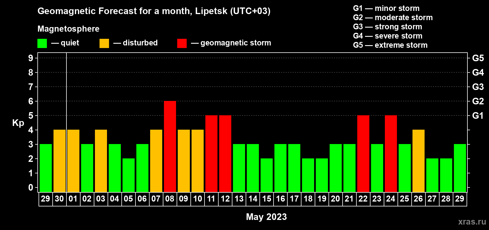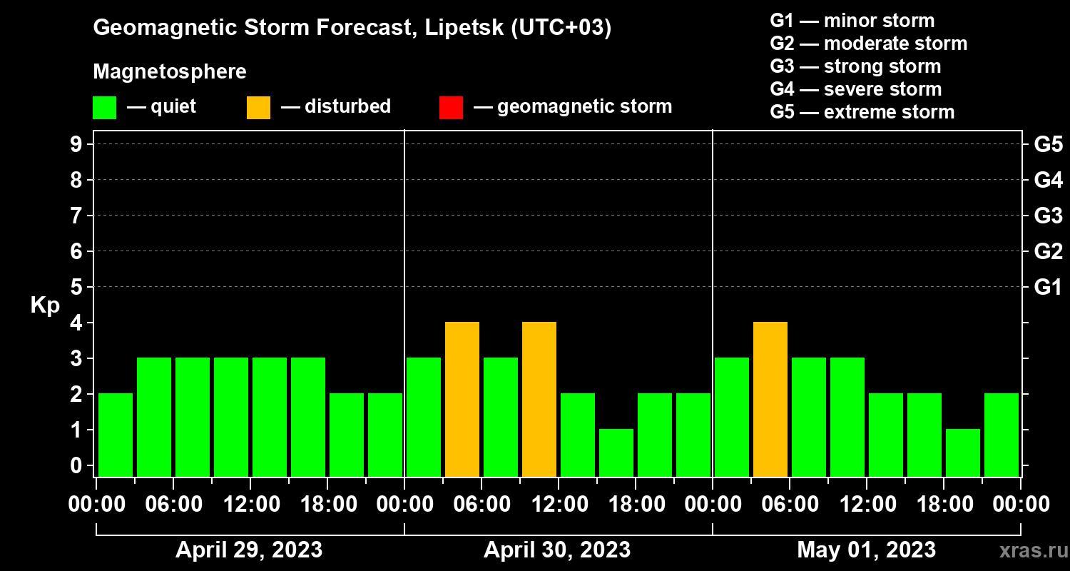 Geomagnetic storm forecast in Lipetsk for Apr 29, 2023