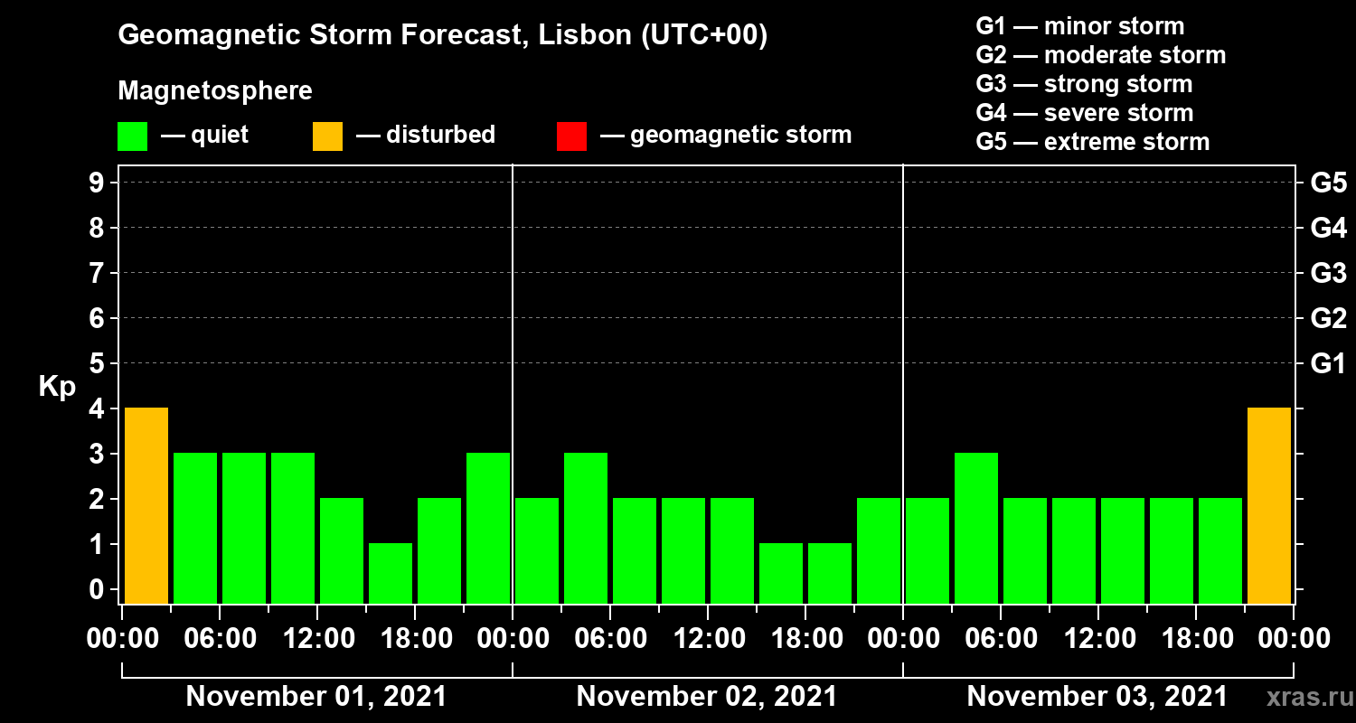 Geomagnetic storm forecast in Lisbon for Nov 01, 2021