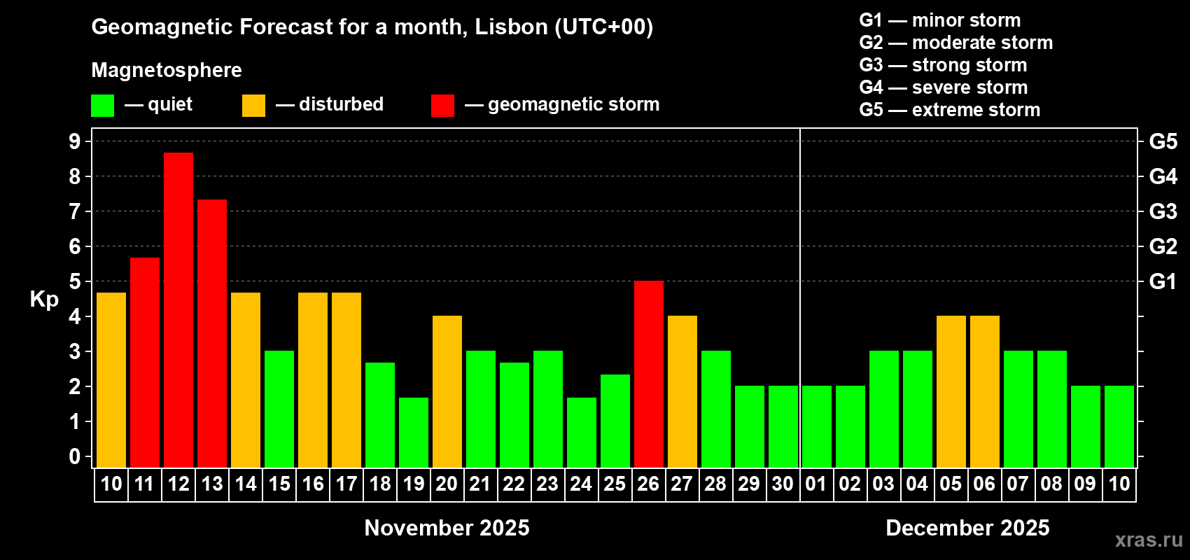 Geomagnetic storm forecast in Lisbon for Nov 10, 2025
