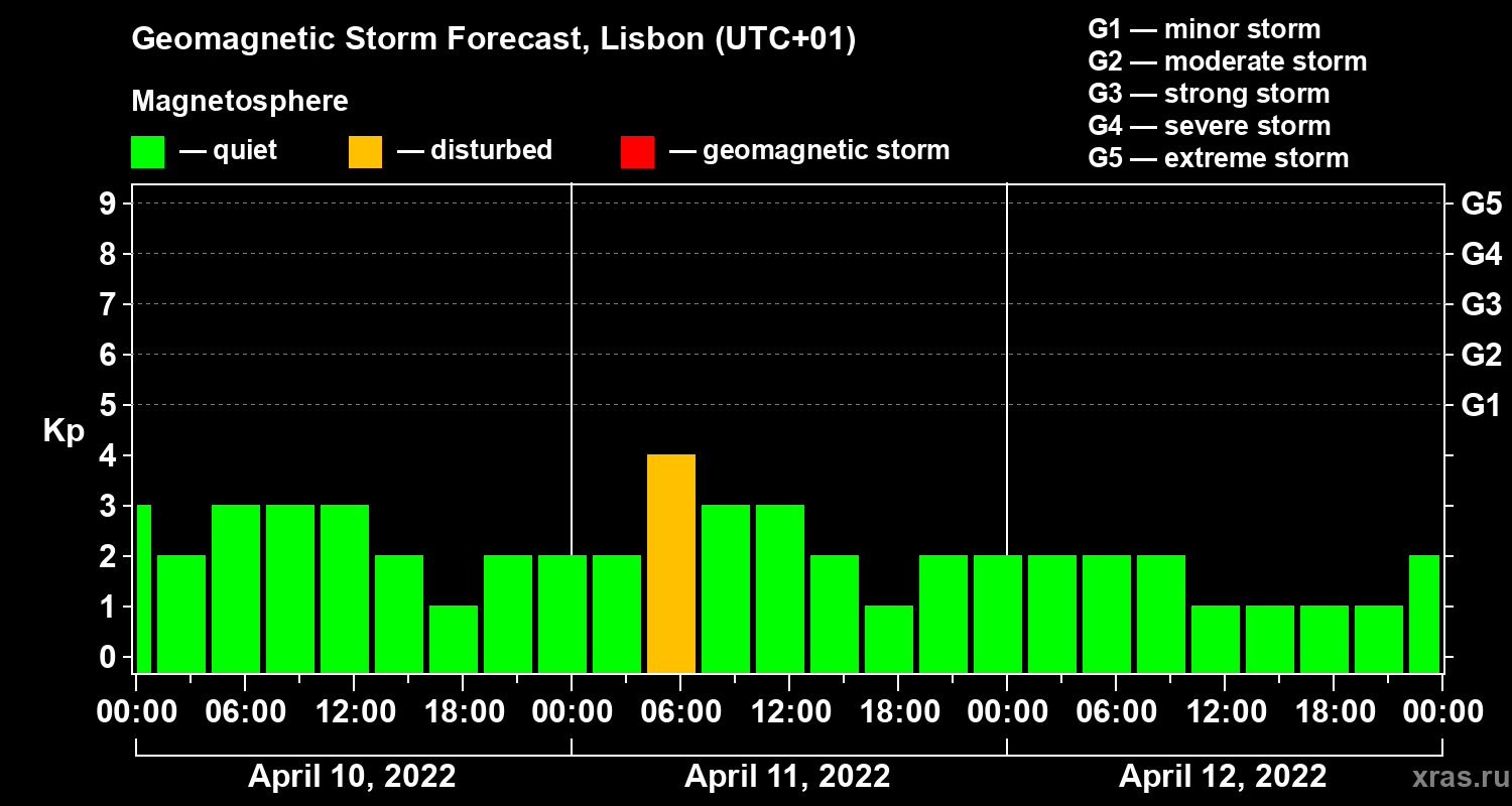 Geomagnetic storm forecast in Lisbon for Apr 10, 2022