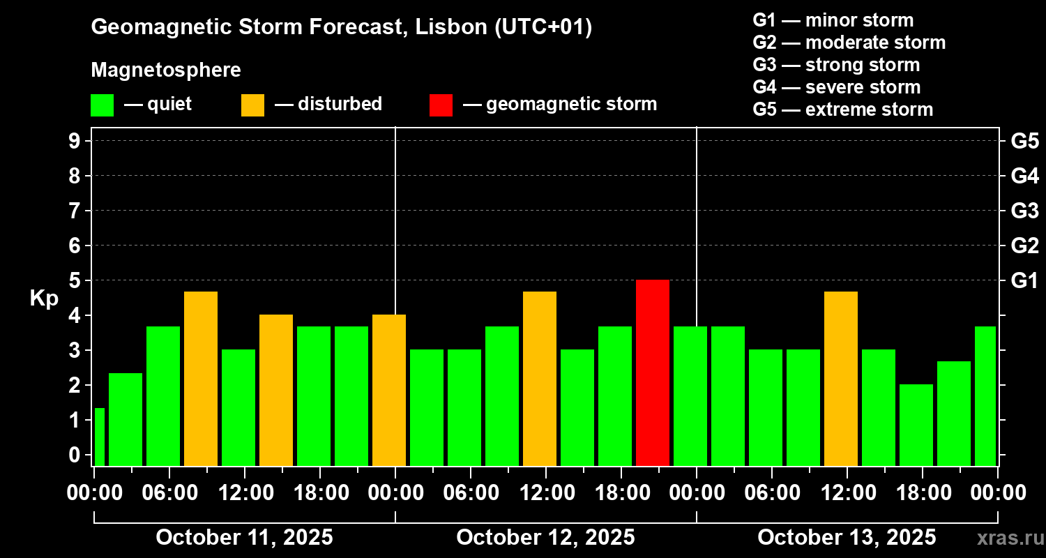 Geomagnetic storm forecast in Lisbon for Oct 11, 2025