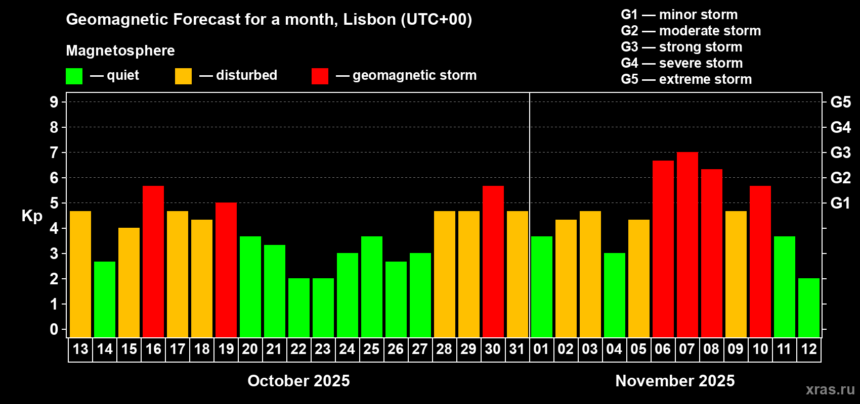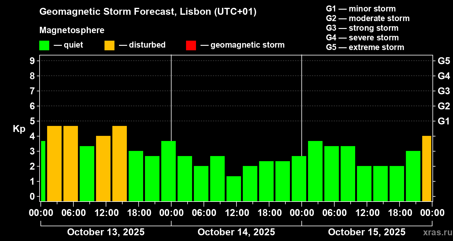 Geomagnetic storm forecast in Lisbon for Oct 13, 2025