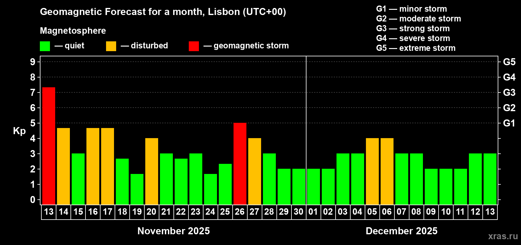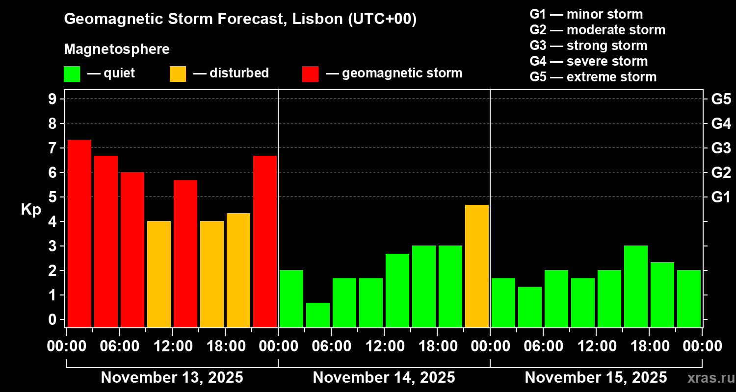 Geomagnetic storm forecast in Lisbon for Nov 13, 2025