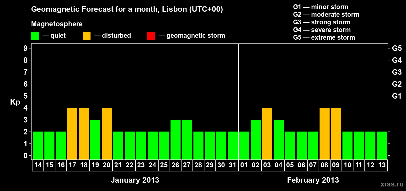 Geomagnetic storm forecast in Lisbon for Jan 14, 2013