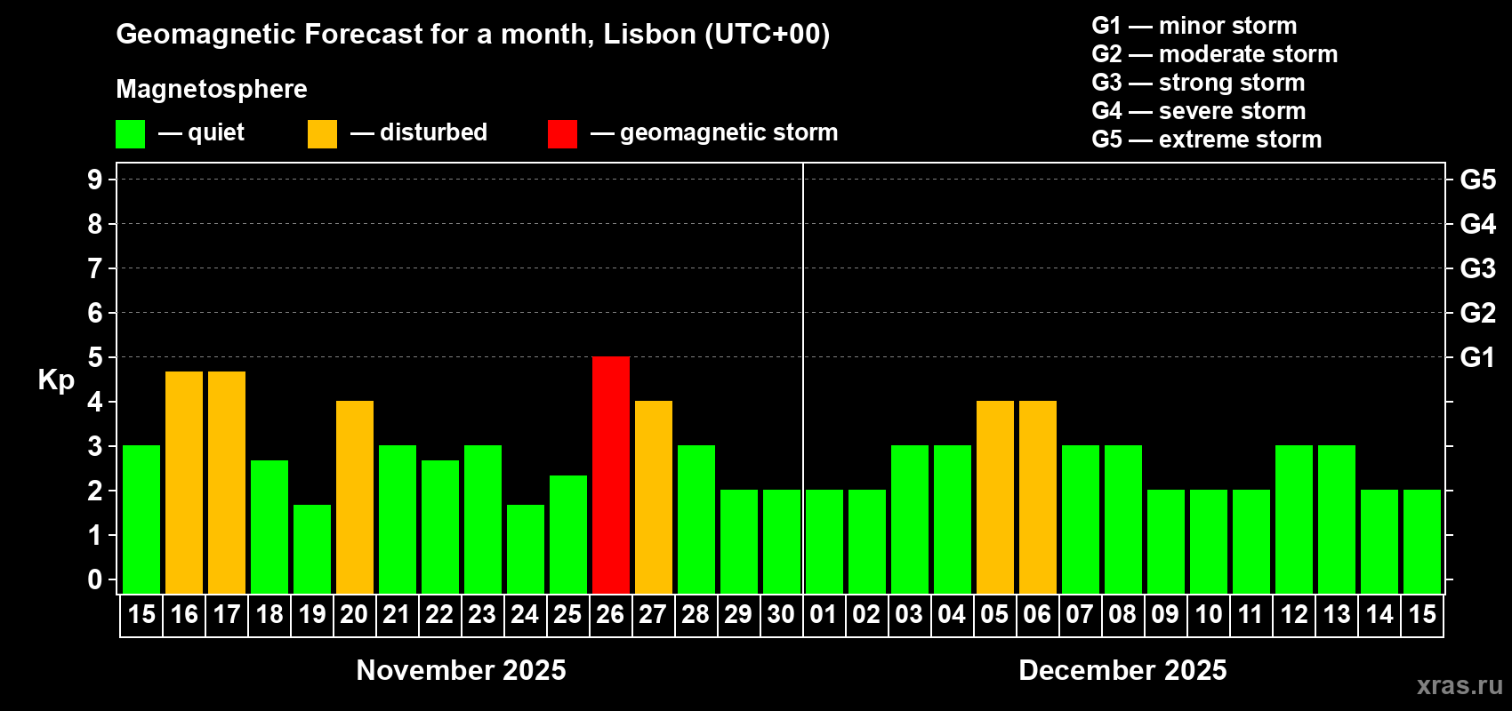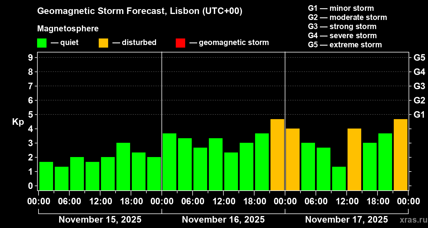Geomagnetic storm forecast in Lisbon for Nov 15, 2025