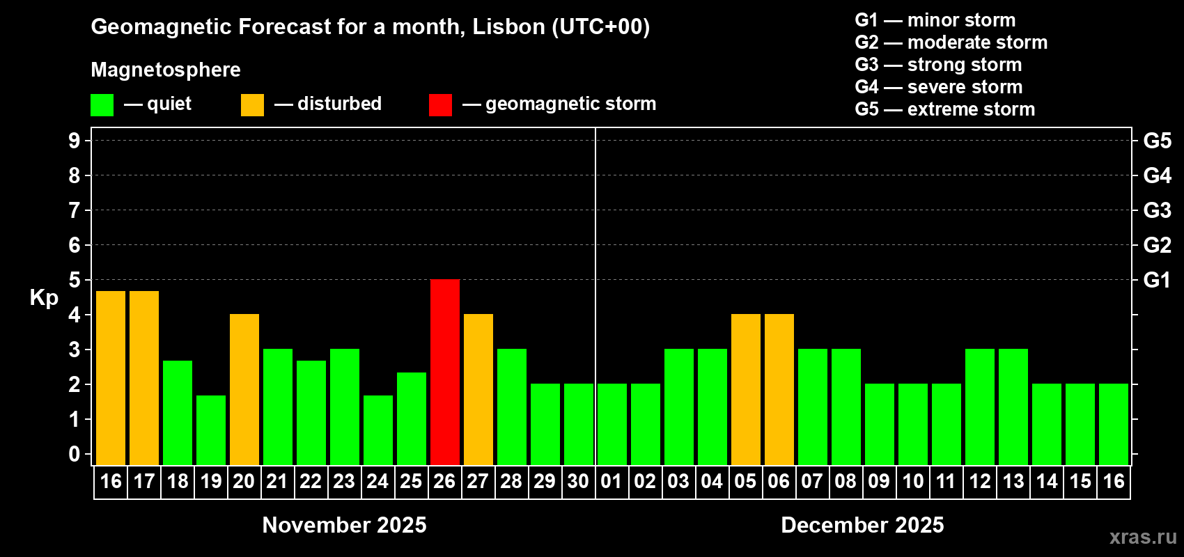 Geomagnetic storm forecast in Lisbon for Nov 16, 2025