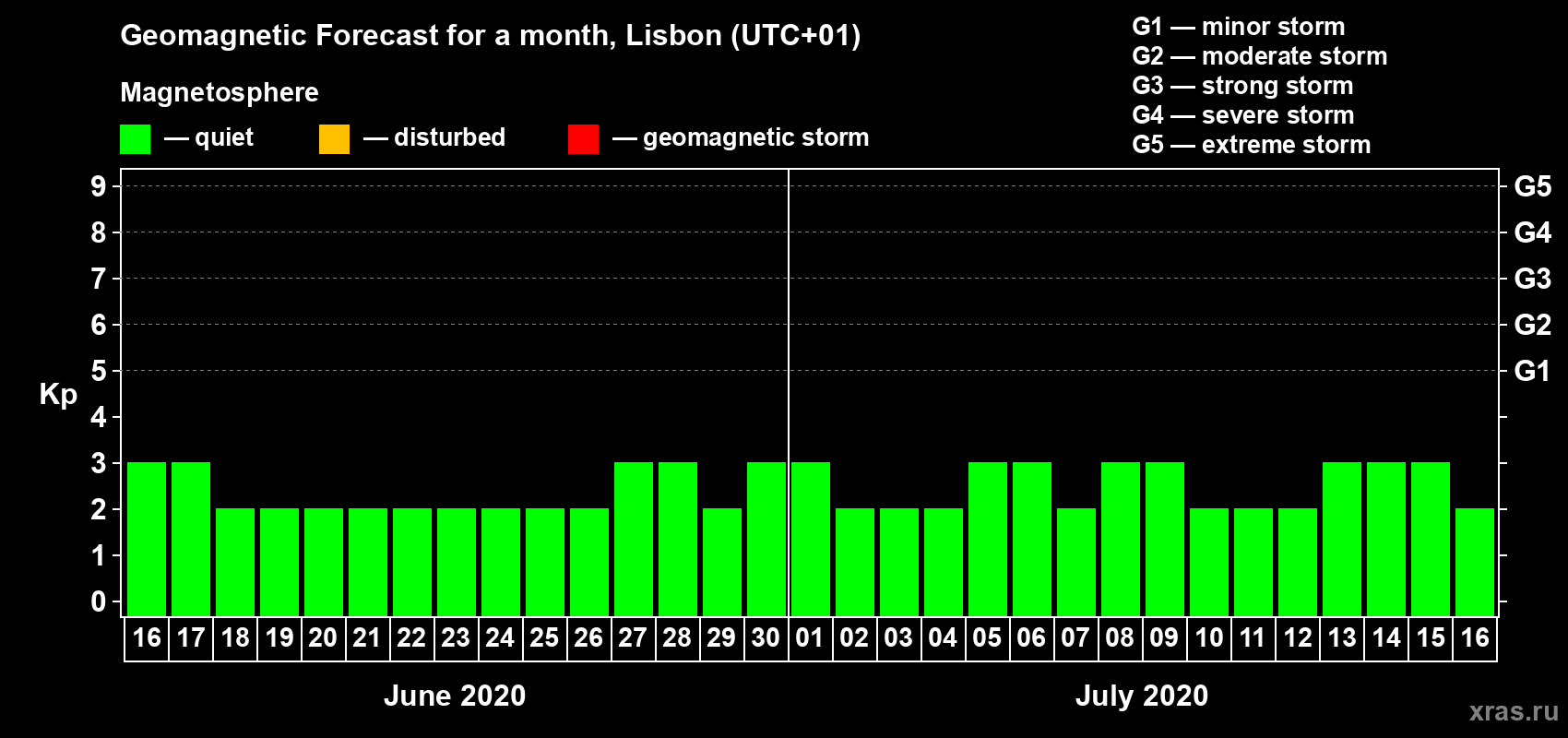 Geomagnetic storm forecast in Lisbon for Jun 16, 2020