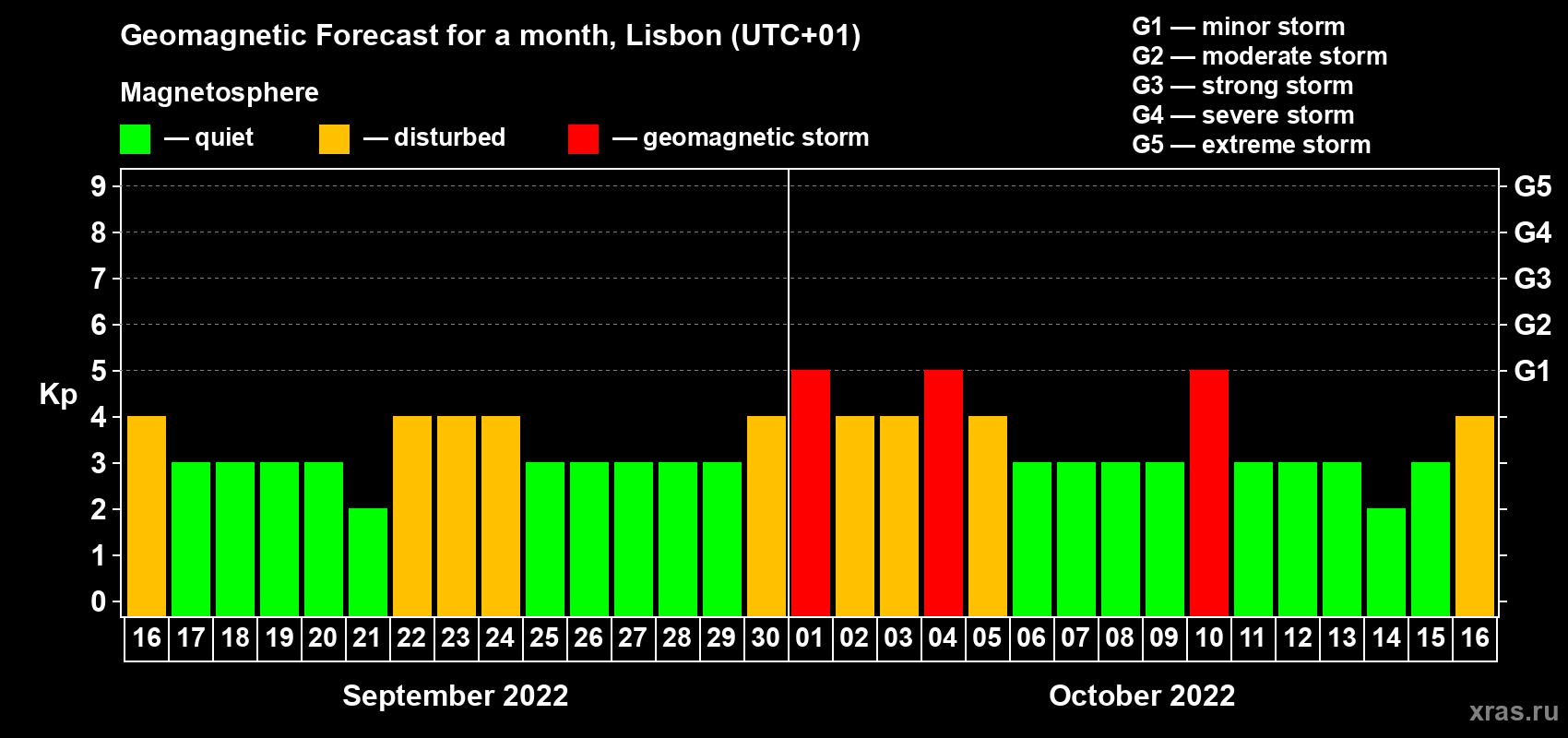 Geomagnetic storm forecast in Lisbon for Sep 16, 2022