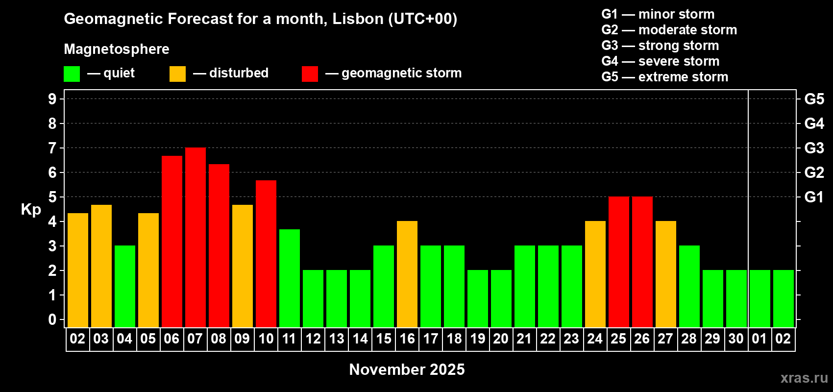 Geomagnetic storm forecast in Lisbon for Nov 02, 2025