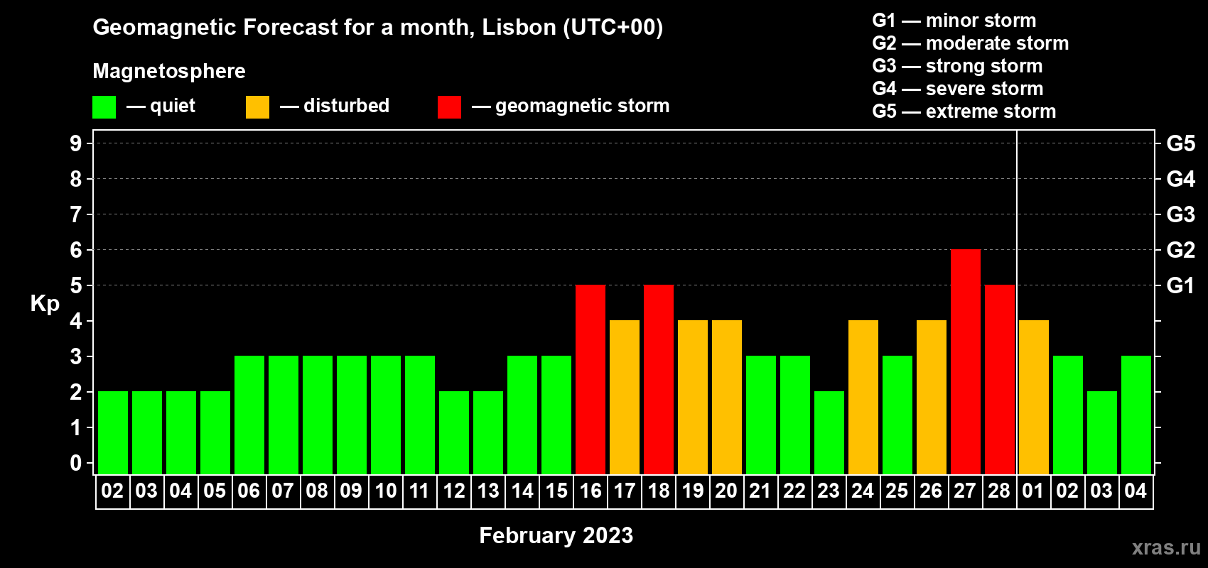 Geomagnetic storm forecast in Lisbon for Feb 02, 2023