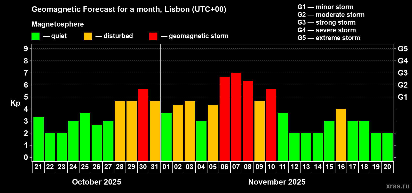 Geomagnetic storm forecast in Lisbon for Oct 21, 2025
